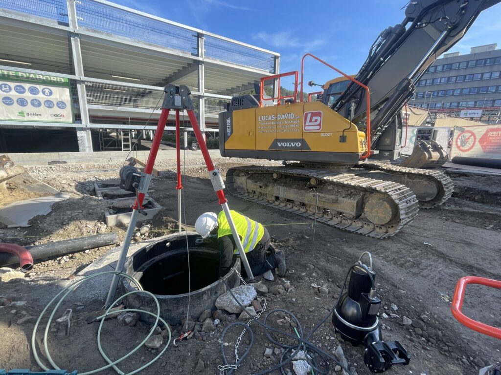 « Un séparateur à hydrocarbures en PEHD fut nécessaire pour traiter les eaux du parking avant de les renvoyer à l’égout via une station de relevage qui reprend également l’ensemble des eaux de pluie. Cet ouvrage réalisé avec une cuve en PEHD double paroi Ø1800 mesure 5 mètres de haut avec une garde d’eau de 4 m³ et comprend une échelle en PEHD, un système de grille antichute ainsi que deux pompes Grundfos permettant chacune de relever un débit de 30 l/s. »