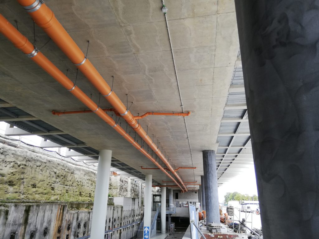 Pour évacuer l’eau du trop-plein d’urgence et des bacs sous les voies, des tuyaux en PP de 315 à 600 mm de diamètre ont été proposés. Ceux-ci ont été raccordés à l’aide de simples manchons. Une méthode plus simple que le soudage étanche à l’air de conduites sous pression dans des zones difficilement accessibles. Les colliers de fixation devaient être suffisamment solides et parfaitement ancrés pour pouvoir supporter le poids de l’eau.