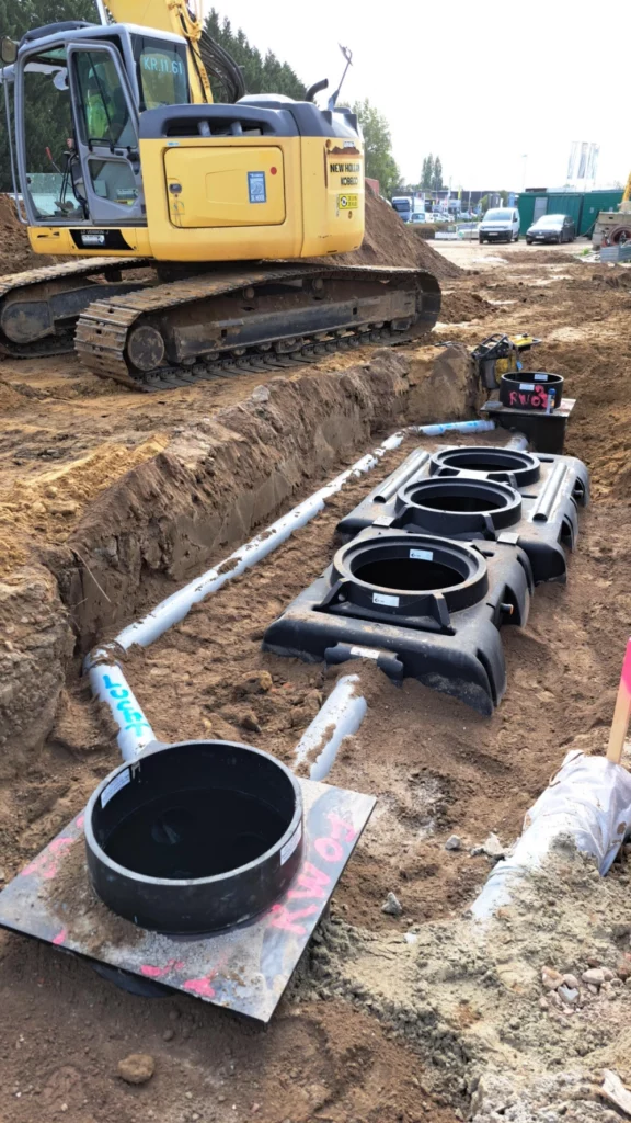 Voor dit dossier werd van bij de start duidelijk dat standaardoplossingen niet zouden volstaan. De werf kende meerdere beperkingen: de torenkraan moest tot de laatste dag operationeel blijven, bovengrondse ruimte was schaars, en de bestaande garage moest open blijven tijdens de werkzaamheden. Samen met grondwerker Demoor, architect Cubyc Architects, de industriebouwer en hoofdaannemer Vandenbussche zocht Deschacht naar de meest economische én technisch haalbare oplossing voor de afwatering van zowel de nieuwbouw als het bestaande gebouw.